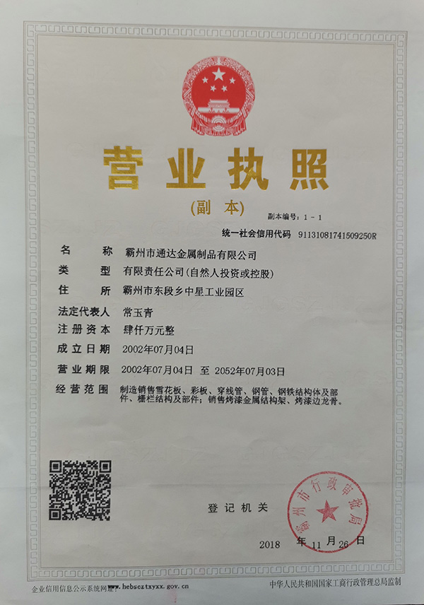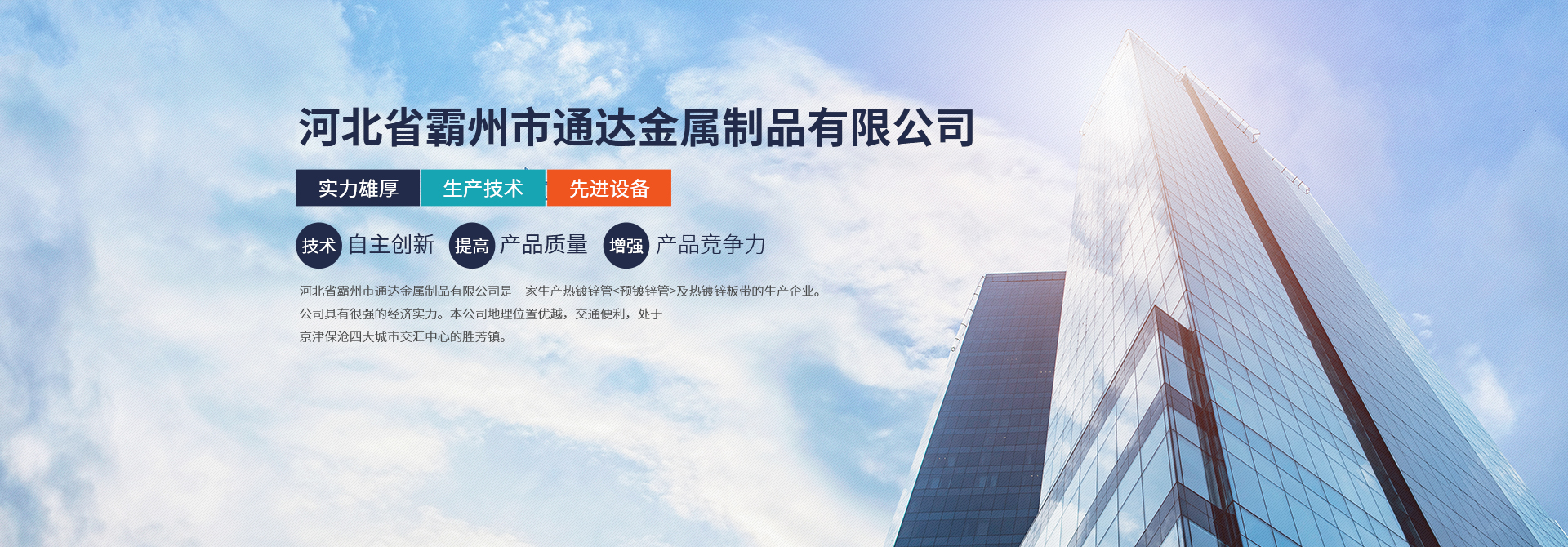 河北省霸州市通達金屬制品有限公司是一家生產熱鍍鋅管<預鍍鋅管>及熱鍍鋅板帶的生產企業(yè)。公司具有很強的經(jīng)濟實力。本公司地理位置優(yōu)越,交通便利,處于京津保滄四大城市交匯中心的勝芳鎮(zhèn)。由于公司不斷發(fā)展壯大,良好的投資環(huán)境為我公司的發(fā)展提供了可靠的保障。本公司是河北省重合同守信用企業(yè),被評為AAA級信用企業(yè)。